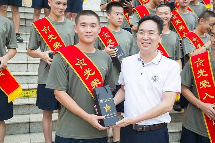 符興干為學(xué)校入伍學(xué)生發(fā)放紀(jì)念品(人民武裝部供圖)