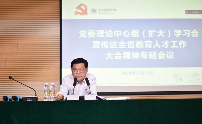 11月12日,海職院召開黨委理論中心組(擴大)學習暨傳達全省教育人才工作大會精神專題會議,深入學習黨的十九屆五中全會精神,傳達省委常委會(擴大)會議、全省教育人才工作大會精神。