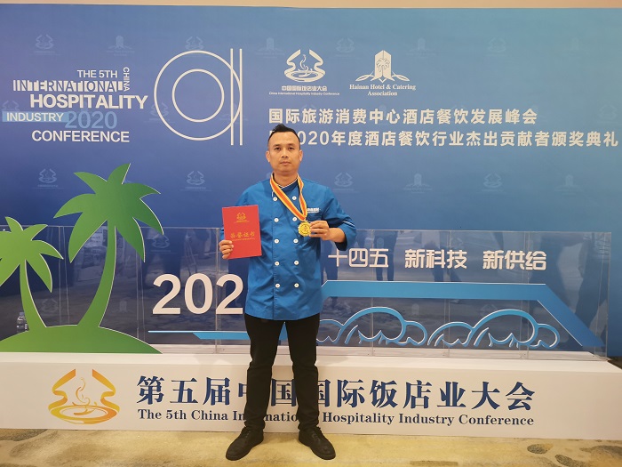 林書芳榮獲2020年海南省行業(yè)職業(yè)技能競賽中式師烹調(diào)(熱菜)項(xiàng)目一等獎(jiǎng)并榮升高級技師(旅游學(xué)院供圖)