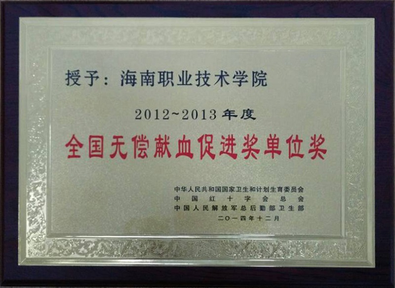 近日獲悉,經(jīng)海南省血液中心、海南無償獻(xiàn)血辦公室推薦,由國家衛(wèi)生健康委員會(huì)、中國紅十字會(huì)總會(huì)及中國人民解放軍總后勤部衛(wèi)生部聯(lián)合授予我校“全國無償獻(xiàn)血促進(jìn)獎(jiǎng)單位獎(jiǎng)”榮譽(yù)稱號(hào),此次也是我校第一次獲得該獎(jiǎng)項(xiàng)。