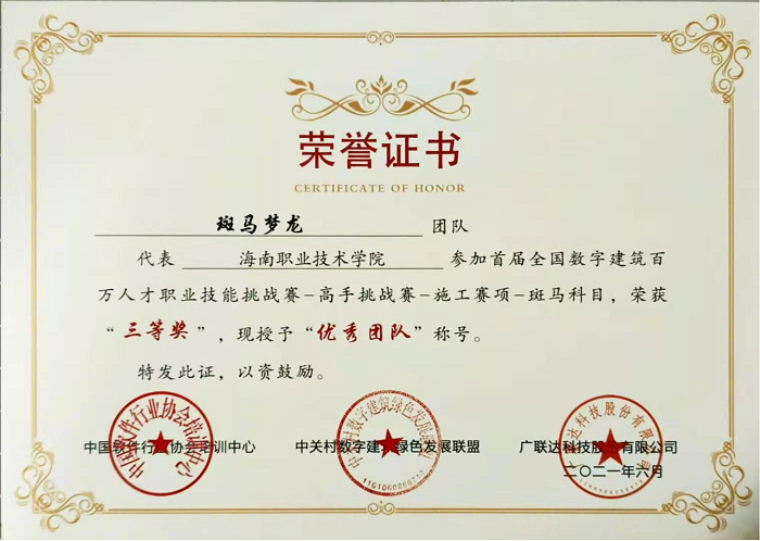 近日,由中國軟件行業(yè)協(xié)會培訓中心、中關村綠色建筑發(fā)展聯(lián)盟與廣聯(lián)達科技股份有限公司聯(lián)合舉辦的首屆全國數(shù)字建筑百萬人才職業(yè)技能挑戰(zhàn)賽中,我校智慧建筑專業(yè)群代表隊榮獲三等獎2項,優(yōu)秀獎1項。