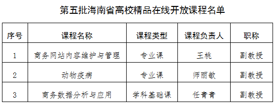 近日,海南省教育廳公布第五批海南省高校精品在線開放課程名單,我校王桃副教授負(fù)責(zé)的《商務(wù)網(wǎng)站內(nèi)容維護(hù)與管理》、師麗敏副教授負(fù)責(zé)的《動物疫病》以及任青青副教授負(fù)責(zé)的《商務(wù)數(shù)據(jù)分析與應(yīng)用》共3門課程被認(rèn)定第五批海南省高校精品在線開放課程。