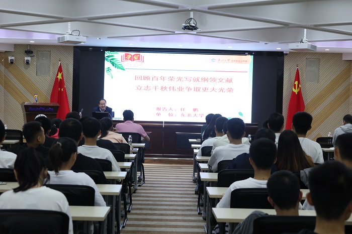 任鵬教授從“中國共產(chǎn)黨百年慶典時(shí)刻的偉大光榮”“中國共產(chǎn)黨創(chuàng)造歷史偉業(yè)的成功原因”和“深化全面建設(shè)社會主義現(xiàn)代化國家的行動自覺”三個(gè)方面闡述了全面建成小康社會的偉大光榮、開啟全面建設(shè)社會主義現(xiàn)代化國家新征程的偉大光榮和慶祝中國共產(chǎn)黨百年華誕的偉大光榮。任鵬指出,在一百年的非凡奮斗歷程中,一代又一代中國共產(chǎn)黨人頑強(qiáng)拼搏、不懈奮斗,涌現(xiàn)了一大批視死如歸的革命烈士、一大批頑強(qiáng)奮斗的英雄人物、一大批忘我奉獻(xiàn)的先進(jìn)模范,形成了一系列偉大精神,構(gòu)筑起了中國共產(chǎn)黨人的精神譜系,為我們立黨興黨強(qiáng)黨提供了豐厚滋養(yǎng)。他勉勵(lì)廣大青年學(xué)生,勇當(dāng)新時(shí)代青年馬克思主義者,青春向黨,奮斗強(qiáng)國。