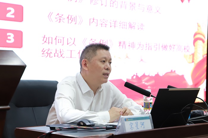 宋星河對《中國共產(chǎn)黨統(tǒng)一戰(zhàn)線工作條例》進(jìn)行了全面系統(tǒng)的闡釋和深入淺出的講解。他就如何以《條例》精神為指引抓好高校統(tǒng)戰(zhàn)工作,“樹立大統(tǒng)戰(zhàn)意識,在提高認(rèn)識上下功夫”、“堅(jiān)持大團(tuán)結(jié)的原則,在針對性和實(shí)效性上下功夫”、“改進(jìn)工作方法、在凝聚人心上下功夫”和“增強(qiáng)工作效果、在有所作為上下功夫”等“四個(gè)下功夫”提出了抓好高校統(tǒng)戰(zhàn)工作的意見和方法。講座對學(xué)校各級黨組織書記和統(tǒng)戰(zhàn)工作人員全面準(zhǔn)確學(xué)習(xí)領(lǐng)會黨的統(tǒng)一戰(zhàn)線理論方針政策,提高黨員領(lǐng)導(dǎo)干部的統(tǒng)戰(zhàn)意識,確?!稐l例》各項(xiàng)規(guī)定得到有效貫徹落實(shí),推動統(tǒng)戰(zhàn)工作高質(zhì)量發(fā)展具有重要的指導(dǎo)意義。
