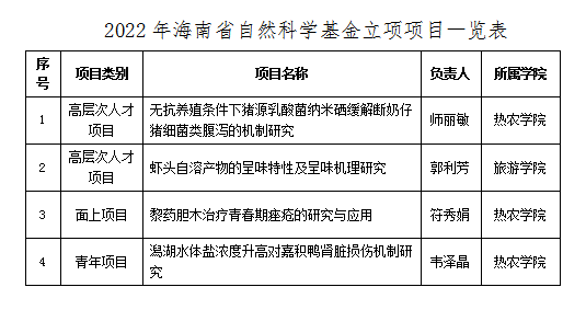 日前,海南省科技廳公布2022年海南省自然科學(xué)基金立項(xiàng)項(xiàng)目。我校共獲批立項(xiàng)項(xiàng)目4項(xiàng),其中高層次人才2項(xiàng)、面上項(xiàng)目1項(xiàng)、青年項(xiàng)目1項(xiàng),資助經(jīng)費(fèi)共34萬(wàn)元。在立項(xiàng)數(shù)量、立項(xiàng)率、項(xiàng)目金額、立項(xiàng)覆蓋面上相較于往年均有新突破。