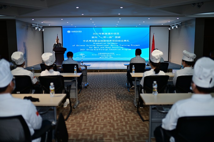 5月7日下午,海南職業(yè)技術(shù)學(xué)院承擔(dān)的教育部2021年教育援外項目“面向一帶一路國家中式烹飪職業(yè)技能培養(yǎng)項目培訓(xùn)班”結(jié)業(yè)典禮在圖書館高端培訓(xùn)中心舉行。學(xué)校副校長康霖出席結(jié)業(yè)儀式并講話。國際教育學(xué)院院長溫蕾主持結(jié)業(yè)儀式。