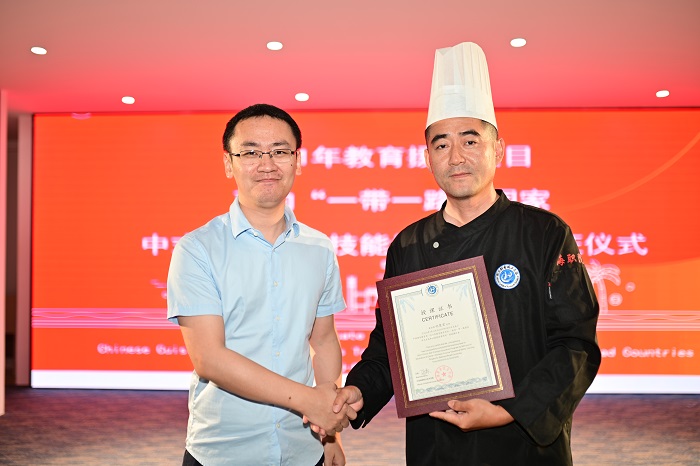 隨后,康霖為授課教師代表、尼泊爾校方代表頒發(fā)證書。據(jù)悉,受新冠疫情影響和出入境政策調(diào)整背景下,學(xué)校啟動線上援外培訓(xùn)、項目。學(xué)校與海南省紀(jì)寬宏技能大師工作室強(qiáng)強(qiáng)聯(lián)手,聘請大師級授課團(tuán)隊,以受援國實際需要為基礎(chǔ),以人才培養(yǎng)為核心,精心制作授課課程包,內(nèi)容包含20道中國傳統(tǒng)菜品加工與制作的完整過程教學(xué)視頻、詳細(xì)烹飪教學(xué)資料等,從菜肴文化、用料搭配到制作過程中刀工的運用、火候的掌握,到最后菜肴的味道、裝盤的美化等各個環(huán)節(jié),都力求做到精益求精、通俗易懂。