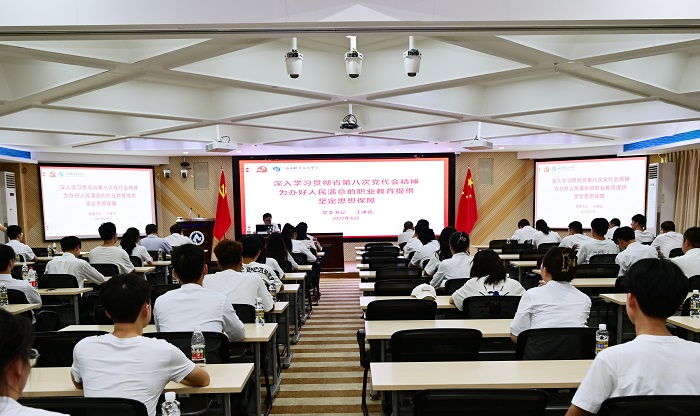王承慶從要充分認(rèn)識省第八次黨代會的重大意義,要準(zhǔn)確把握和深刻領(lǐng)會省第八次黨代會精神的核心要義,要為辦好人民滿意的職業(yè)教育提供堅定思想保障等三個方面,對省第八次黨代會的時代背景、主題主線、過去五年的重大成就、寶貴經(jīng)驗和未來五年的歷史方位、總體要求、工作目標(biāo)、重點任務(wù)等進行了全面系統(tǒng)的解讀。他指出,要全面落實黨的“立德樹人”根本任務(wù),落實好“為黨育人、為國育才”的教育目標(biāo),積極主動適應(yīng)職業(yè)教育改革發(fā)展,以生為本,努力把他們培養(yǎng)成建設(shè)海南自由貿(mào)易港的合格接班人。