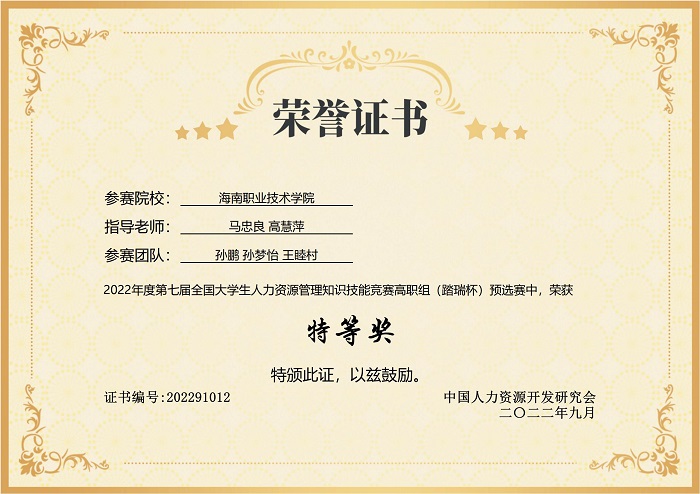 9月25日,2022年第七屆全國大學生人力資源管理知識技能競賽選拔賽圓滿落幕。由我校經(jīng)濟管理學院人力資源管理專業(yè)學生孫鵬、孫夢怡、王睦村等三名同學組成的參賽團隊,在人力資源管理專業(yè)馬忠良、高慧萍兩位老師的帶領(lǐng)下積極參賽,最終以小組第一,高職院校排名第12名的好成績,喜獲第七屆全國大學生人力資源管理知識技能競賽選拔賽“特等獎”,成功晉級全國總決賽。