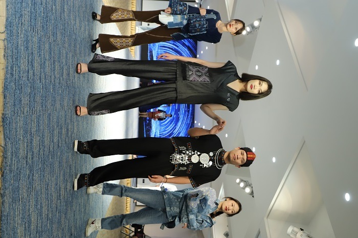 研修期間,學員共完成由5個主題組成的41件黎錦文創(chuàng)作品,作品在結業(yè)典禮現(xiàn)場通過模特走秀的方式進行展示。本次研修不僅是專家向傳承人傳授知識及技藝的課堂,同時也是海南省五大黎族方言區(qū)的傳承人及其弟子充分開展織錦技藝交流的平臺。