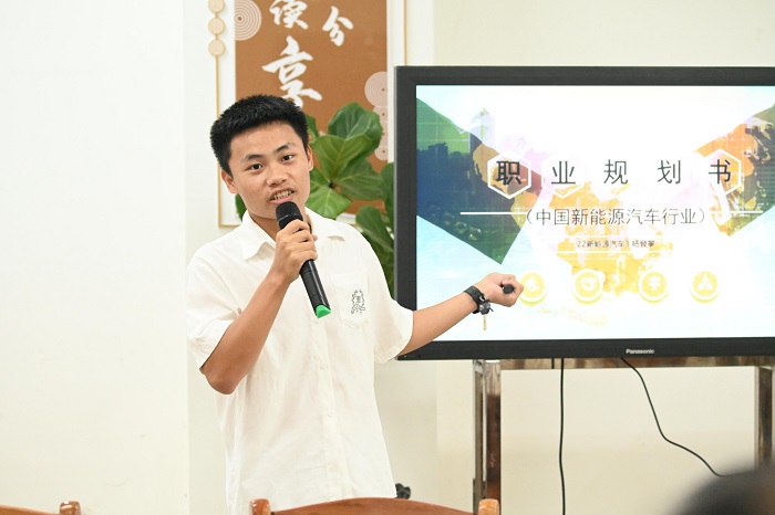 本次活動共分為“導(dǎo)讀、領(lǐng)讀、分享、互動”等四大環(huán)節(jié)。在主持人陳東老師開始導(dǎo)讀后,來自工信學(xué)院、藝術(shù)學(xué)院、經(jīng)管學(xué)院的六名同學(xué)進行了領(lǐng)讀環(huán)節(jié)。他們通過PPT以圖文并茂的方式分享了他們對自身職業(yè)生涯規(guī)劃的暢想,同時通過對自身興趣、愛好、能力、性格中的優(yōu)缺點以及成長環(huán)境等方面的深入分析,結(jié)合所處時代以及所讀專業(yè)的特點,勾勒出一幅幅職業(yè)定位、目標以及實施的步驟的美好愿景。他們的分享觀點鮮明、視角獨特,引起了在場同學(xué)們的共鳴。校友學(xué)長分享環(huán)節(jié)中,周錦濤及鐘國勝同學(xué)通過他們切身的經(jīng)歷,分享了他們在實習(xí)、求職、就業(yè)、創(chuàng)業(yè)等初步邁向職場歷程的一些心得和體會以及酸甜苦辣,內(nèi)容豐富詳實,不時激起現(xiàn)場陣陣掌聲。