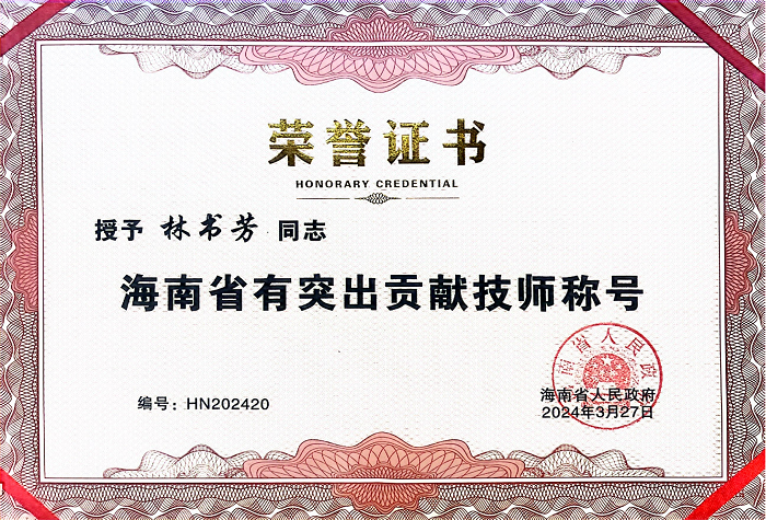 我校林書(shū)芳老師榮獲“海南省有突出貢獻(xiàn)技師”稱號(hào)