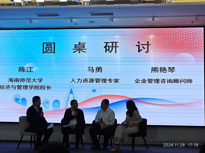 活動中,人力資源管理專家馬勇老師圍繞“如何通過薪酬設(shè)計實現(xiàn)降本增效”展開系統(tǒng)講解,深入淺出地剖析了薪酬策略與企業(yè)效益之間的緊密聯(lián)系,為在場師生帶來了實用的行業(yè)見解。隨后,海南師范大學(xué)經(jīng)濟(jì)與管理學(xué)院院長陳江、馬勇老師以及企業(yè)管理咨詢顧問師熊艷琴共同參與了圓桌研討,就人力資源管理領(lǐng)域的熱點議題展開深度交流,探討了行業(yè)前沿動態(tài)與就業(yè)市場的新需求。