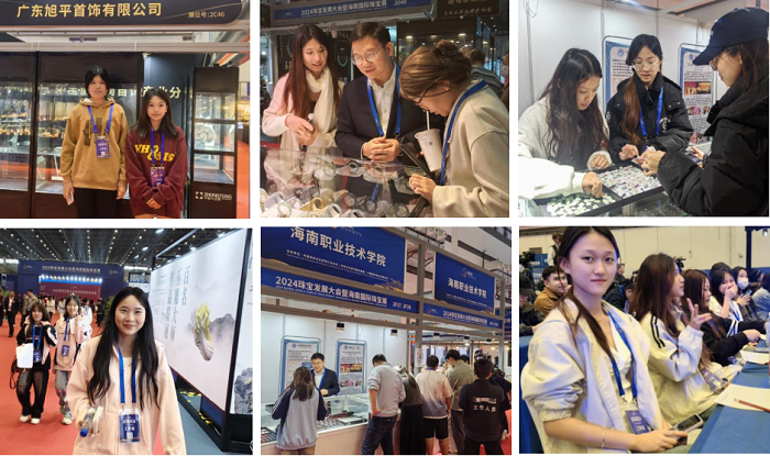 活動期間,指導(dǎo)教師以項目化教學(xué)方式發(fā)布學(xué)習(xí)任務(wù),學(xué)生們分別在海南職業(yè)技術(shù)學(xué)院展區(qū)、廣州旭平時尚首飾等展區(qū)通過現(xiàn)場調(diào)研、學(xué)術(shù)論壇學(xué)習(xí)、珠寶展相關(guān)崗位體驗以及教師現(xiàn)場教學(xué)等環(huán)節(jié)開展實踐學(xué)習(xí)。這些活動不僅拓寬了學(xué)生的視野,加深了他們對珠寶鑒定鑒賞、珠寶營銷、首飾陳列、展會布置等專業(yè)知識的理解,還讓他們有機(jī)會近距離接觸行業(yè)動態(tài),感受珠寶藝術(shù)的獨(dú)特魅力。