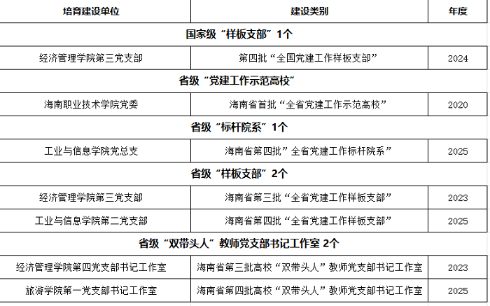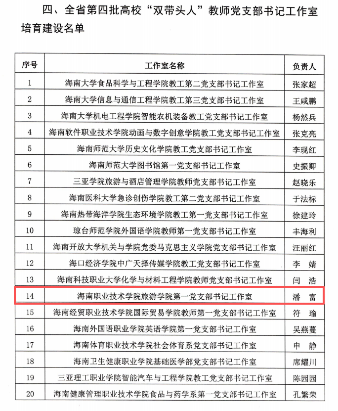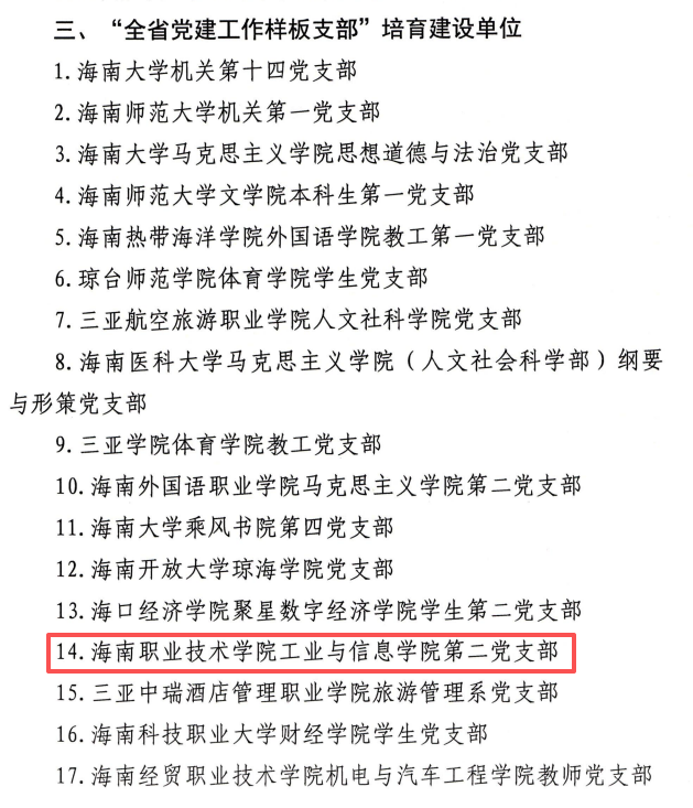 近日,中共海南省委教育工作委員會公布全省第四批新時(shí)代高校黨建示范創(chuàng)建和高校“雙帶頭人”教師黨支部書記工作室培育建設(shè)名單。其中,我校工業(yè)與信息學(xué)院黨總支入選“全省黨建工作標(biāo)桿院系”培育建設(shè)單位;工業(yè)與信息學(xué)院第二黨支部入選“全省黨建工作樣板支部”培育建設(shè)單位;旅游學(xué)院第一黨支部書記工作室入選“雙帶頭人”教師黨支部書記工作室培育建設(shè)名單。