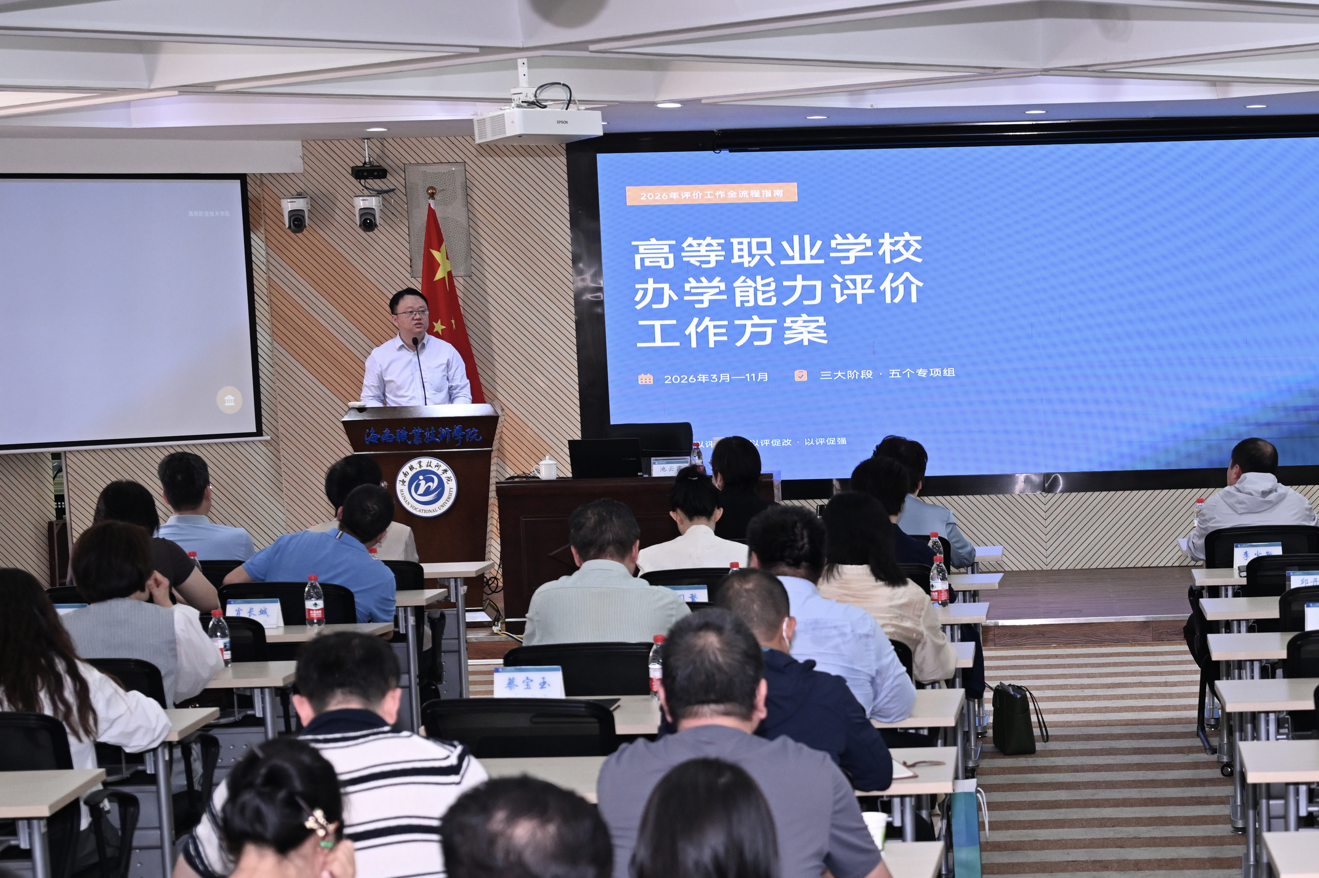 校長助理沈振國首先圍繞2026年高等職業(yè)學校辦學能力評價的相關要求,對迎評工作進行年度部署與部門分工。