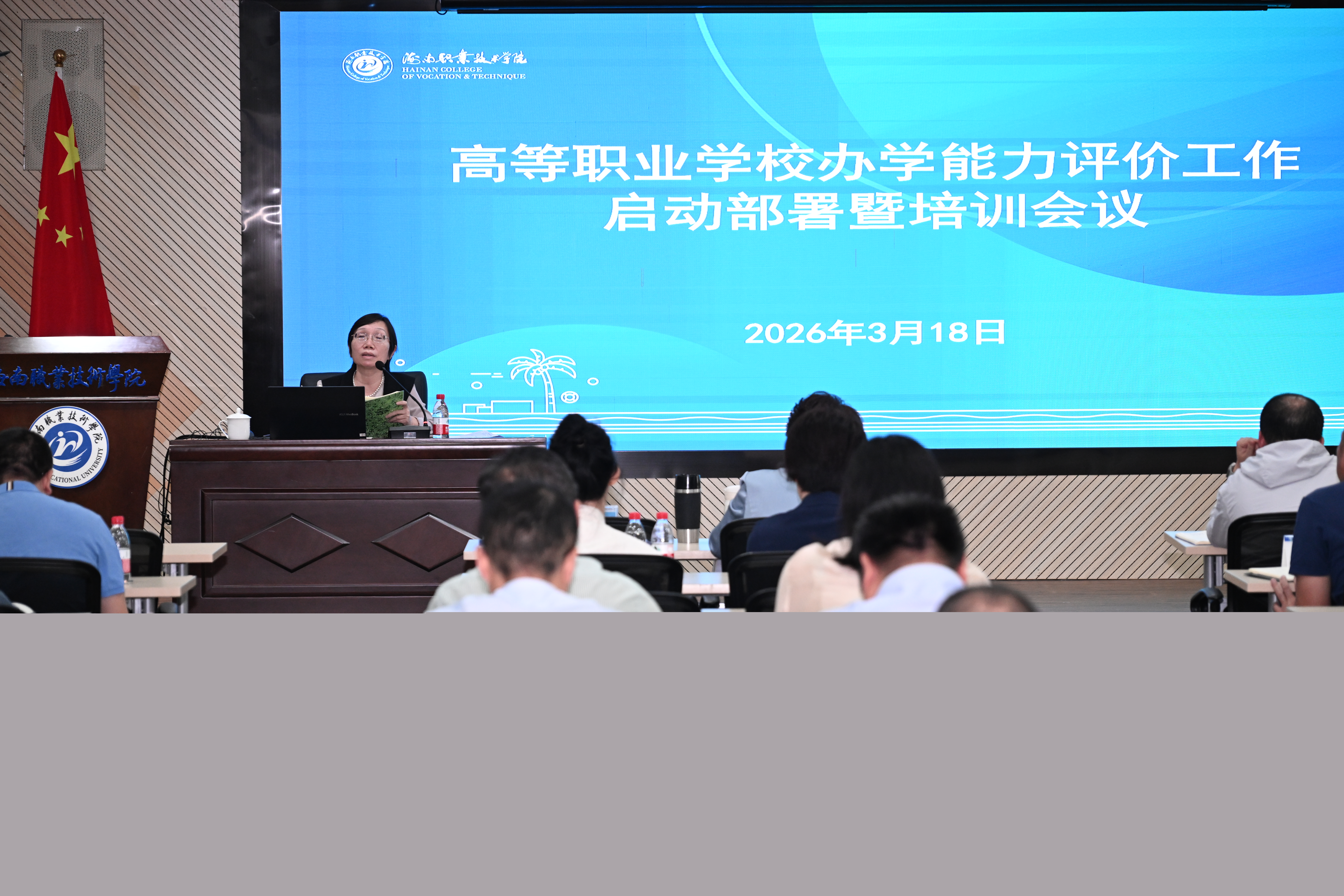 為深入貫徹落實學校年度工作部署,確保2026年高等職業(yè)學校辦學能力評價工作規(guī)范有序、高效開展,3月18日下午,海職院在圖書館六樓第一會議室召開了辦學能力評價工作啟動部署暨培訓會議。會議由教務處牽頭組織,旨在對辦學能力評價工作進行系統(tǒng)性部署與全員動員,推動學校以評促建、以評促改。代校長黃銀珍,黨委委員、副校長符興干,副校長李琳娜,黨委委員、校長助理沈振國出席會議。會議由沈振國主持。