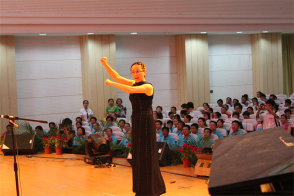 比賽中全體教職工按所屬黨總支及工會類別分成十余個小組,按照相應順序逐次登場表演。各代表隊爭奇斗艷,精彩紛呈。圖書館小組梁棟副院長高亢洪亮的領唱《我愛五指山、我愛萬泉河》激起全場一片歡騰,拉開了本屆紅歌大賽的序幕,此后后勤保衛(wèi)處整齊劃一的“警哥”裝扮、旅游藝術學院代表隊深具時代背景和國際旅游島特色的島服著裝、經(jīng)管學院代表隊的兒童領唱、都在場內(nèi)激起了一陣陣的掌聲,不斷地將本次大會推向高潮。